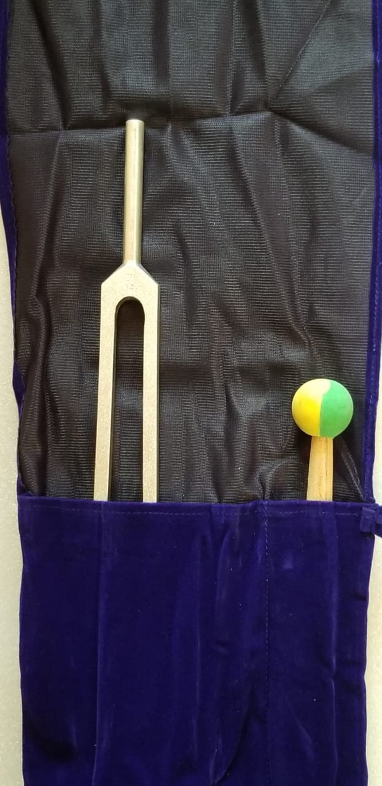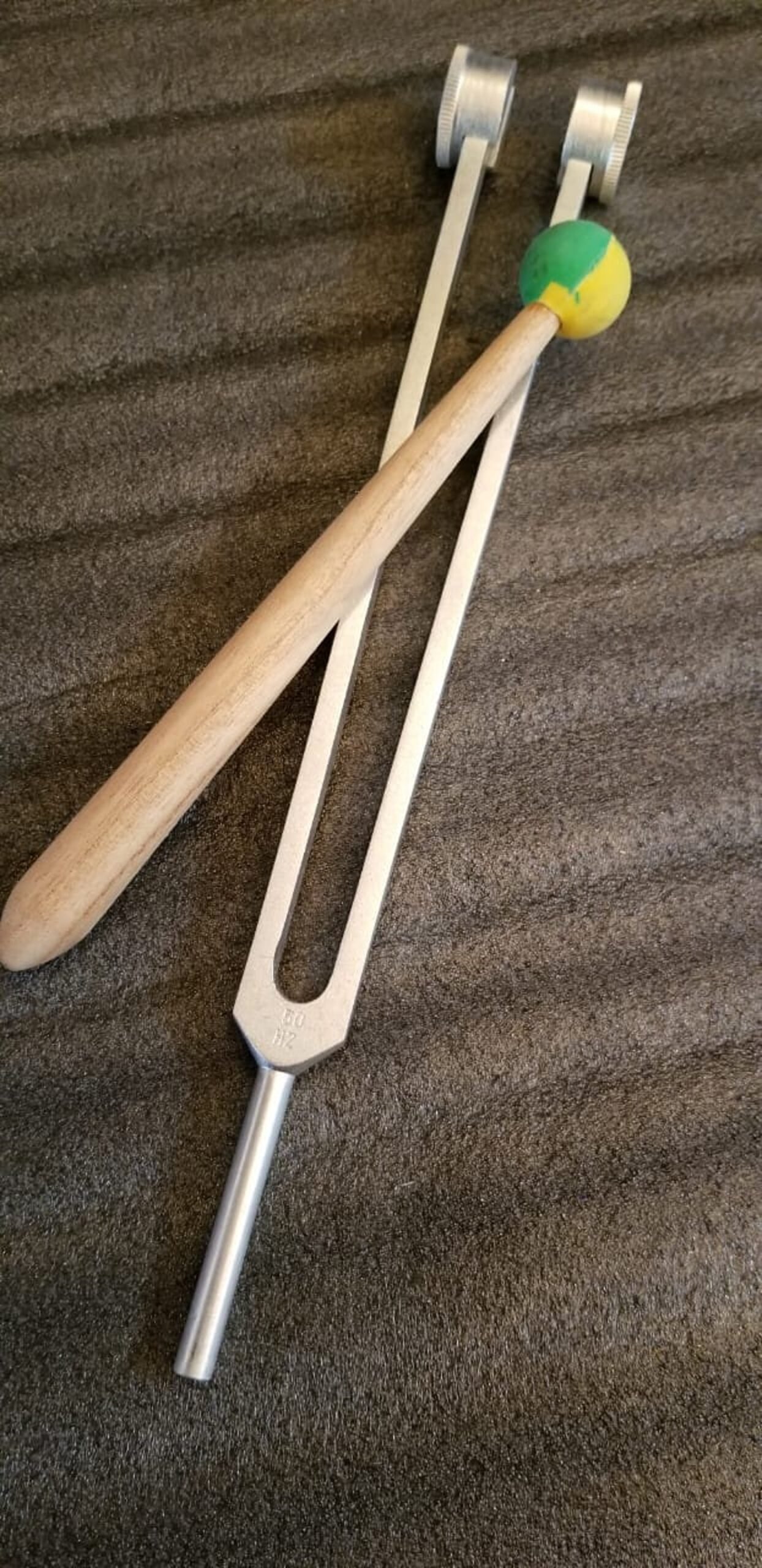 Comes with Presentation Pouch as shown. This tuning fork is based on 50 Hz. Fork Dimensions Approx: 31.5cm x 5cm x 3cm.A nerve fires at a frequency of 50 Hz carrying a message from the brain or to the brain. When some trauma to the body occurs, the nerve tells the brain something is out. The brain reacts to this process by correcting it. If the damage is too great for the brain to repair easily, it starts sending endorphins to ease the pain. If the damage is to the nerve, the frequency for information is hindered in the flow to the brain. This tuning fork can be used to relieve pain from pulled or strained muscles.It is also excellent for removing those knots that develop in the muscles. It will help in releasing the tightness of cramps so that the muscle will relax and the brain will send the endorphins to help with the pain. Place the end of the stem on the area where there is pain. You may also place the side of the stem in the same area. On the weighted end of the tuning fork pinch the two ends together and slide your fingers off quickly. Hitting the end of the fork on a hard rubber object is not needed to cause the maximum amount of vibration.